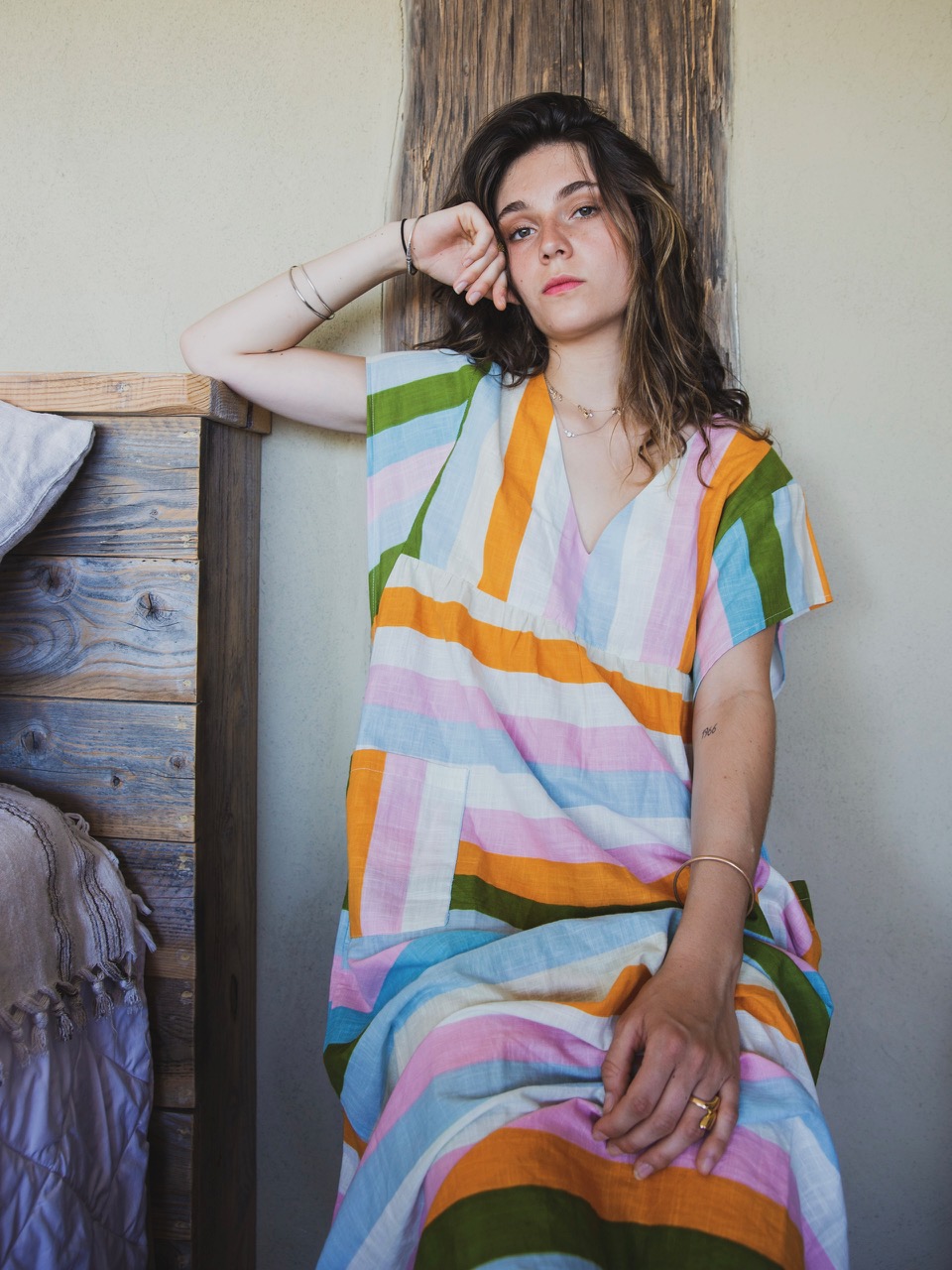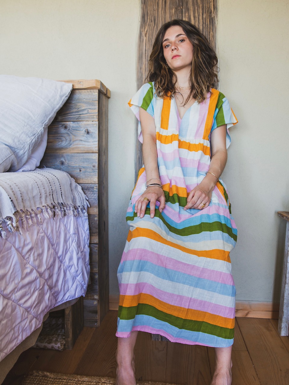 Robe en coton douce et légère aux rayures pastel. Coupe ample et fluide avec encolure en V et manches courtes.