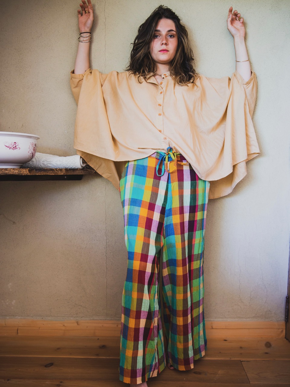 Chaque pièce est fabriquée artisanalement, de légères variations de couleur peuvent apparaître et font partie du caractère unique du vêtement.