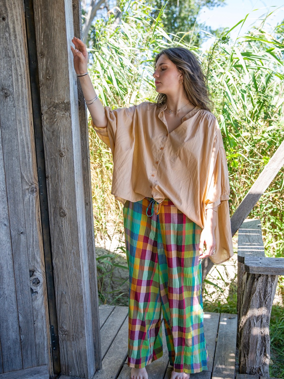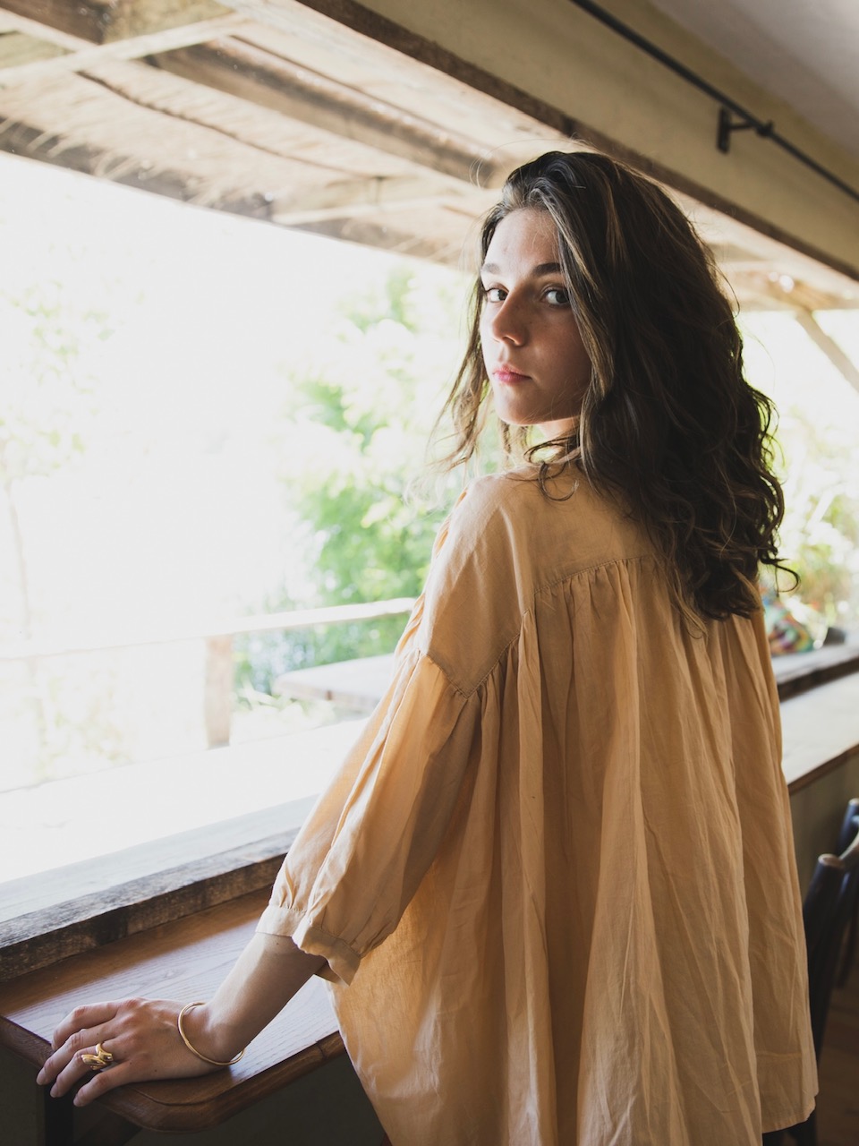 Blouse ample en voile de coton léger et vaporeux. Coupe fluide avec manches larges, encolure arrondie et boutonnage sur le devant.